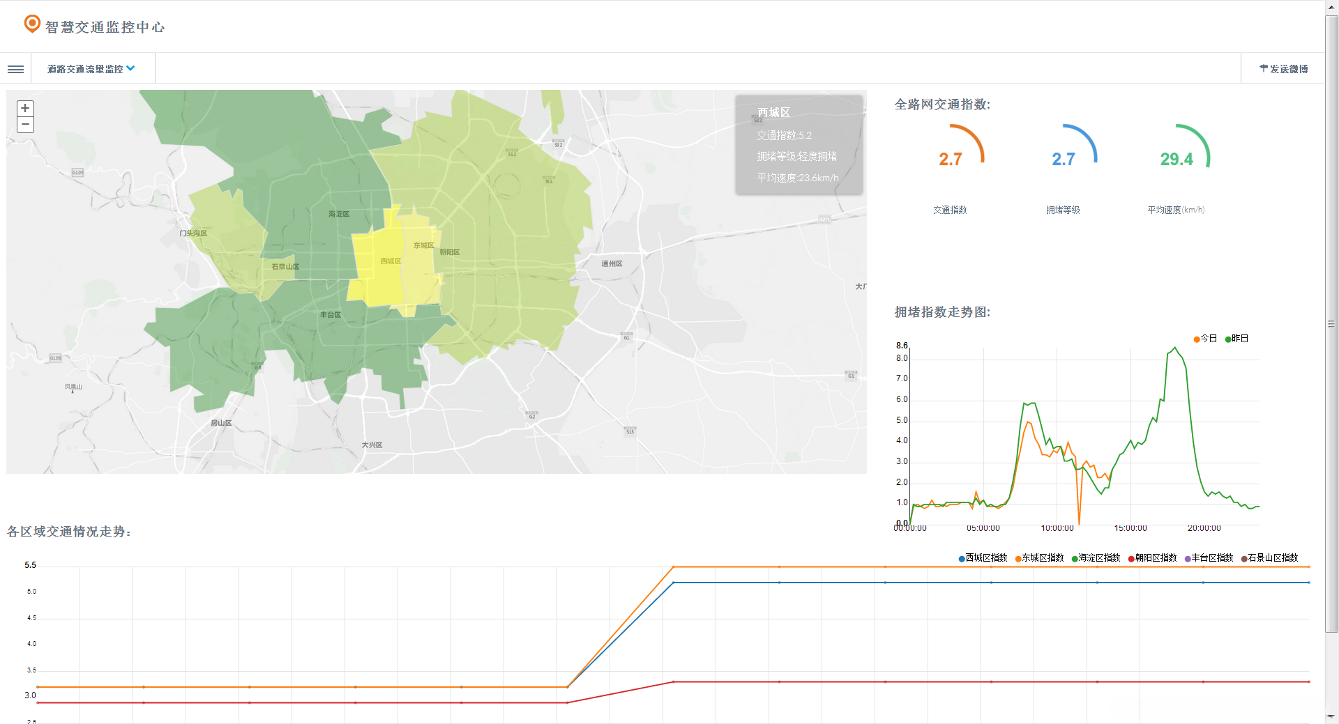 包括区域路网交通指数、全路网交通指数、全路网拥堵指数走势图以及各区域实时交通情况走势。