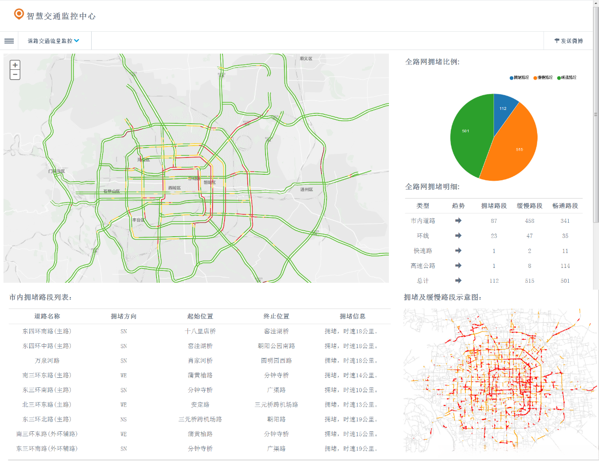 包括实时交通流量图、全路网拥堵比例、全路网拥堵明细、市内拥堵路段列表以及拥堵及缓慢路段示意图。