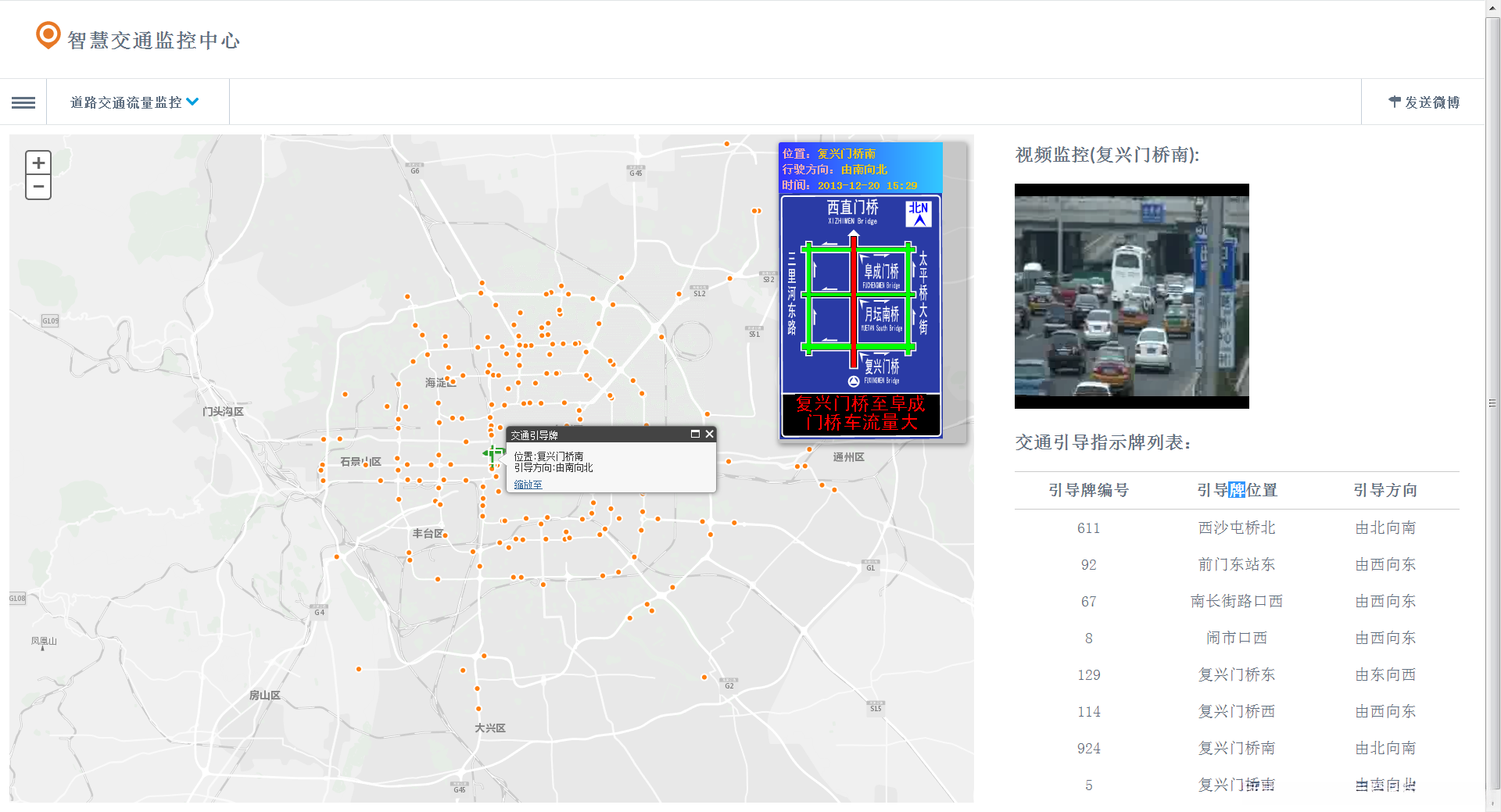 包括交通指导指示牌分布图及列表。可以查看当前指示牌实时状态。以及该地点的实时监控视频展示(视频为模拟)。