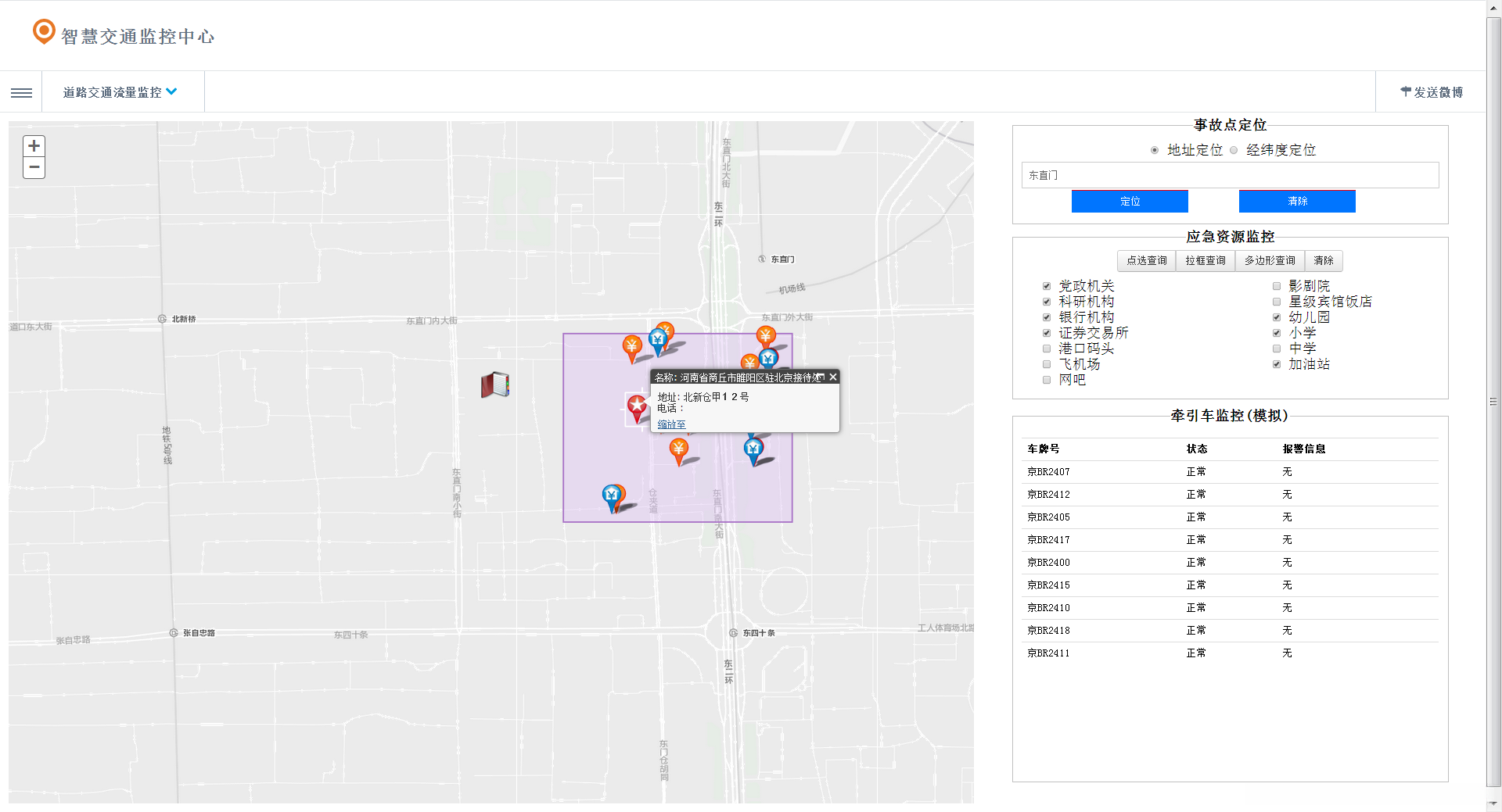 可进行事故点定位。通过多种空间查询方式灵活查找事故点附件的可用应急资源。