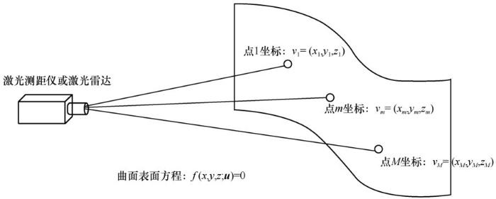 基于激光的高方向性特征,预期能够实现更高的定位精度。一种可行的方法是利用激光测距仪或激光雷达的毫米级测距能力,并结合激光的方向信息,描绘出待定位目标表面多个点的空间坐标。借助激光测距仪或激光雷达进行目标定位原理示意如图3所示,可利用这些测距仪或雷达估计得出目标表面的M个点的空间坐标。利用这些表面空间坐标,与已知的目标表面几何特征f(x,y,z,u)=0进行匹配,即可计算得出目标的准确位置,其中,f(x,y,z,u)=0是目标表面上的点(x,y,z)满足的空间约束关系,它以待估向量uu作为参量,uu是与目标位置和姿态相关的参数向量。该定位方法要求被测表面不具备平移和旋转不变性,以避免定位模糊问题。因此,当目标表面呈现曲面形状时,定位效果更为理想,并且能够同时估计出目标的姿态信息。
