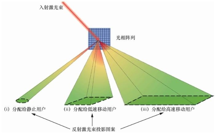 针对多用户通信问题,其中一种方法是采用基于LED的可见光通信,通过将激光进行扩束实现覆盖范围。同时,也可以利用多束窄激光自动跟踪以提高能量效率。激光光束的偏转可通过MEMS、振镜等微机械系统,或者光学RIS技术来实现。光移动通信技术采用光相阵列,能够灵活分配入射激光功率,从而实现多用户覆盖。图5所示为基于SLM的光束分配示意图[98-99]。文献[100-101]进一步探讨了多个用户处于移动状态时的功率分配、波束形状和切换时间等问题,研究表明使用空间光调制器具有显著优势。值得注意的是,光相阵列可被视为一种光学RIS,是移动无线光通信的关键技术之一。尽管如此,该技术仍需解决初始对准接入和零级衍射等关键问题。