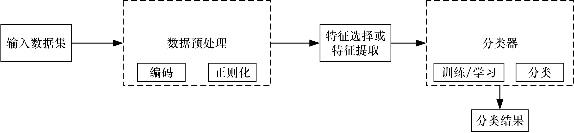 支持向量机(Support Vector Machine, SVM)一般用于解决小样本、非线性以及高维度数据等挑战问题,在入侵检测领域具有广泛的应用前景。在数据预处理阶段实施降维操作能够显著提升检测效率,在相关研究中Chen等人[17]提出了一种基于压缩采样的SVM入侵检测模型,在该模型中通过应用压缩感知理论中的压缩采样方法对网络数据流进行特征提取并完成降维处理随后利用SVM算法对提取后的特征进行分类判定从而有效降低了训练时间和检测时间消耗的与此同时Wang等人[19]则提出了一种改进型的特征处理方法通过对原始特征序列取对数边际密度比值的方法实现了特征质量的有效提升在此基础上构建了一个基于SVM的入侵检测系统经过NSL-KDD数据集上的实验验证表明该系统不仅在准确率方面表现优异而且在检测率误报率以及训练速度等方面均展现出显著的优势相对而言Rigorous等人[18]则采用主成分分析法对原始数据集实施降维操作并通过提取主成分属性集来优化分类效果最终在KDD 99数据集上的实验结果表明其提出的基于主成分分析的SVM攻击检测方法较传统方法显著提升了检测效率并降低了误报率。