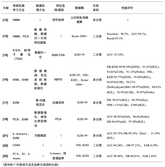 传统机器学习方法在入侵检测领域得到了深入应用。表1归纳了基于传统机器学习方法进行入侵检测的相关研究工作,并具体阐述了所采用的技术手段、数据预处理方式、特征提取方法、评估基准以及任务类型和性能指标等关键要素。