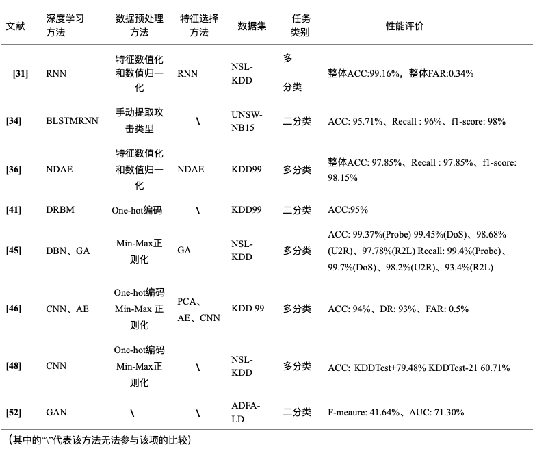 在应用深度学习技术的背景下,入侵检测系统标志着入侵检测技术进入了一个新时代。在 intrusion detection 中可实现 feature 提取与 classification 任务的具体实施。面对海量高维网络流量数据,在 feature 处理与 classification 过程中可实现更高效率与准确性对比优势:相较于传统机器学习方法而言,在相同条件下能够显著提升 detection 效率及 accuracy 水平;表 2 对基于 deep learning 的 intrusion detection 方法进行了综述介绍;但限于研究现状,在 method 比较层面尚未有深入探讨