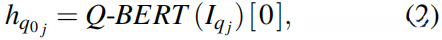 其中,+是连接算符,[CLS]和[SEP]是特殊标记,Q表示问题,Aj表示答案选择j,Iqj是进入Q-BERT的输入序列,表示问题和第j个答案的组合。我们使用一个预训练好的BERT实例来编码每个Iqj序列: