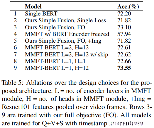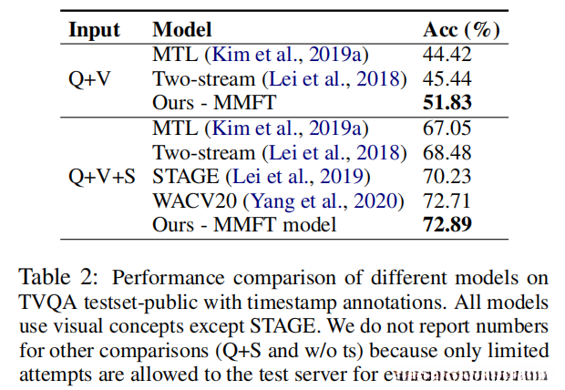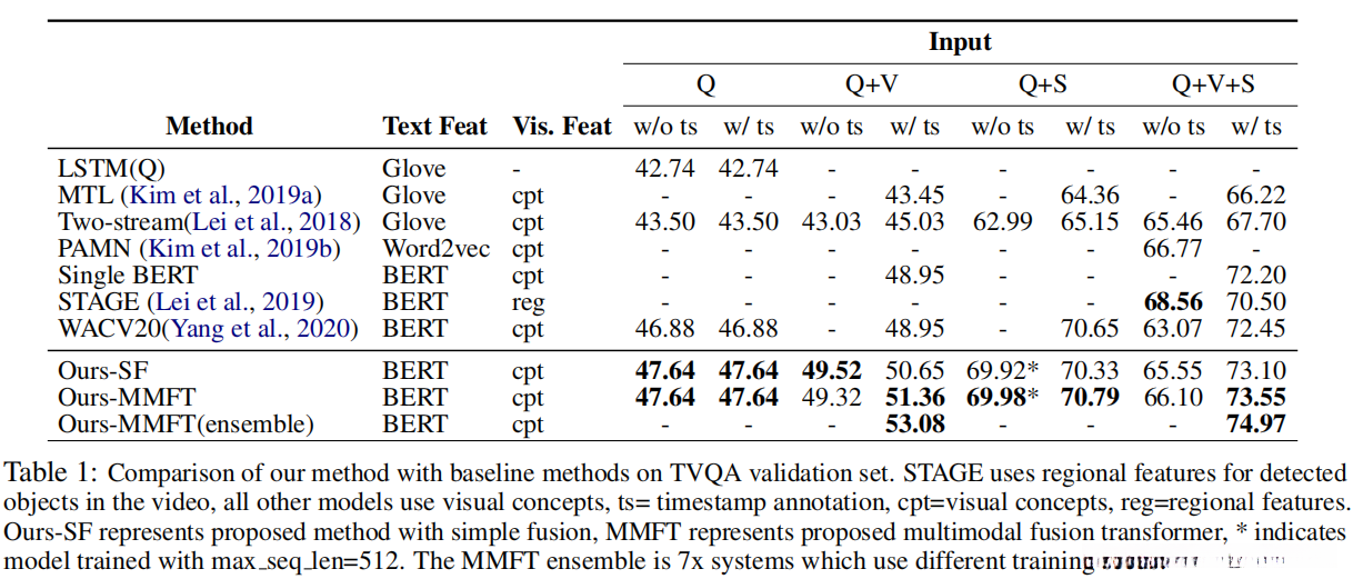 没有时间戳注释(w/o ts):我们也在完整长度的视觉特征和字幕上训练我们的模型。我们的简单融合和Q+V输入上的简单融合和MMFT方法比简单融合和MMFT的双流(Leietal.,2018)分别高出6.49%和5.59%,没有时间戳的字幕是非常长的序列(49%的字幕比长度为256的字幕长),因此QA对可能会被截断。因此,我们在没有时间戳的情况下重新排列输入如下:Q[SEP]Aj.V”和“Q[SEP]Aj.S”分别为V-BERT和S-BERT。具有Q+S输入的模型使用最大seqlen=512进行训练,而Q+V+S模型由于GPU内存的约束,使用最大seqlen=256进行训练。对于Q+S和Q+V+S,我们观察到69.92%和65.55%的简单融合,使用MMFT产生69.98%和66.10%的验证集的精度。