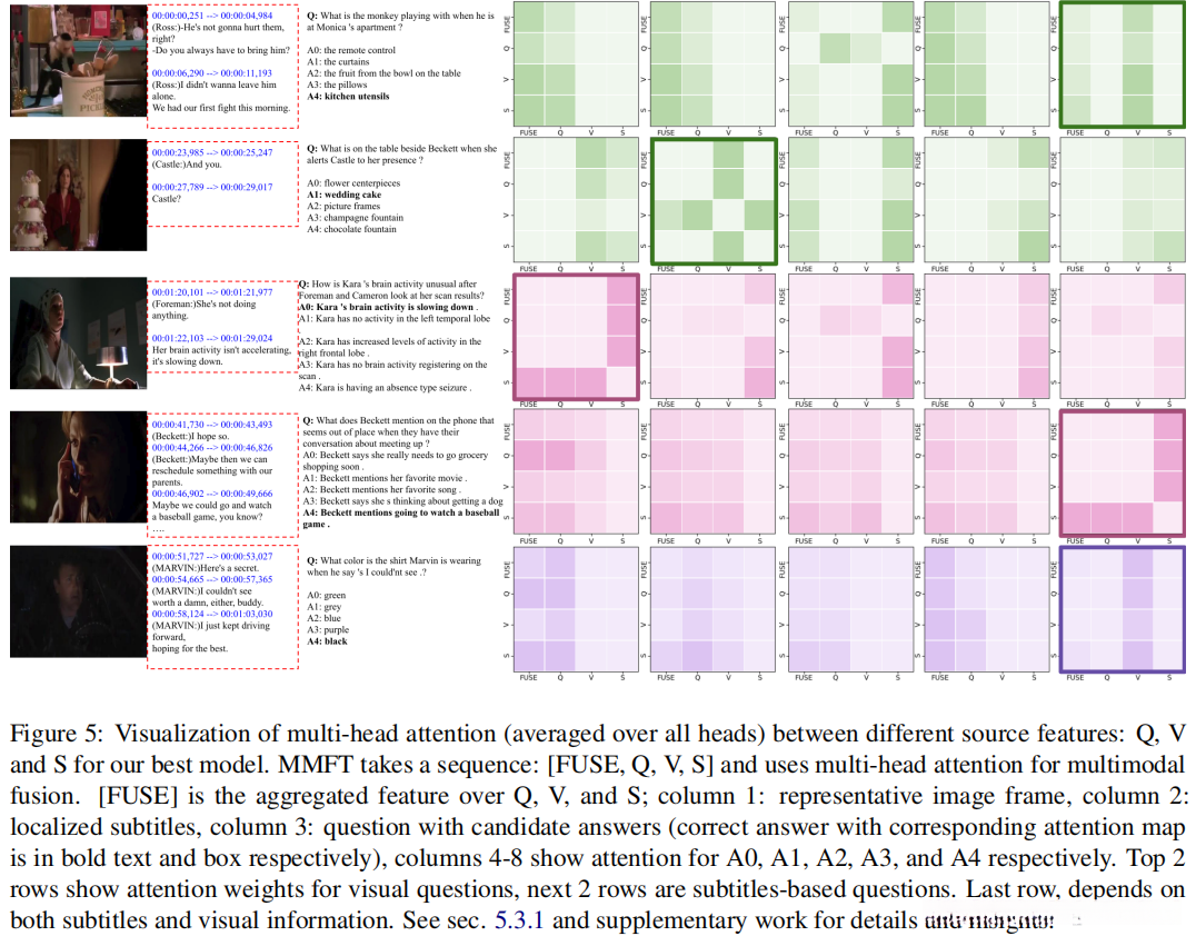 性能分析w.r.t多模式注意:我们研究了MMFT模块聚合多模态源输入(Q、V和S)的行为,我们采用在所有三个来源上进行训练的最佳模型,并在需要了解视觉世界、对话或两者兼有的问题上进行评估。然后,我们可视化了每个候选答案的MMFT模块(H=12)中所有头部的平均注意力得分图,见图5。前2行显示了在所有3个输入源中计算出的注意力得分和视觉问题的[FUSE]向量。因为,[FUSE]是在所有输入模式上的聚合输出。例如,如果问题是关于视觉世界的,视觉部分应该贡献更多。我们可以看到正确答案的注意图在V和[FUSE]向量之间有很高的注意分数,错误的答案涉及到错误的消息来源(Q或S)。第3-5行的行为也是类似的,其中的问题是关于字幕的,与不正确的答案相比,正确的答案赋予了字幕最大的权重。错误答案的热图要么更关注错误的单个输入源,要么是它们的组合。