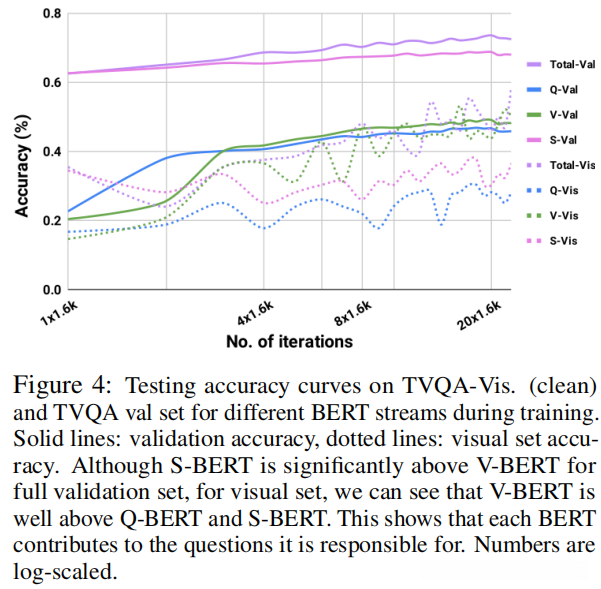 TVQA-Visual(clean):我们观察到,与双流和WACV20相比,clean组(↑11.46%)和(↑4.17%)的改善。TVQA-Visual(clean)与输入中出现的答案有相关的视觉概念或相关的概念。然而,现有的方法(包括我们的方法)表现良好是具有挑战性的。虽然我们的模型观察到这个实验的基线显著改善(↑4-11%),但消除信息是这是不够的。因此,TVQA的这个子集为研究在多模态QA任务中利用视觉特征的进展提供了一个很好的诊断基准。图4在TVQA上可视化每个流在TVQA-Visual clean上的测试性能——在TVQA上训练Q+V模型上的期间。