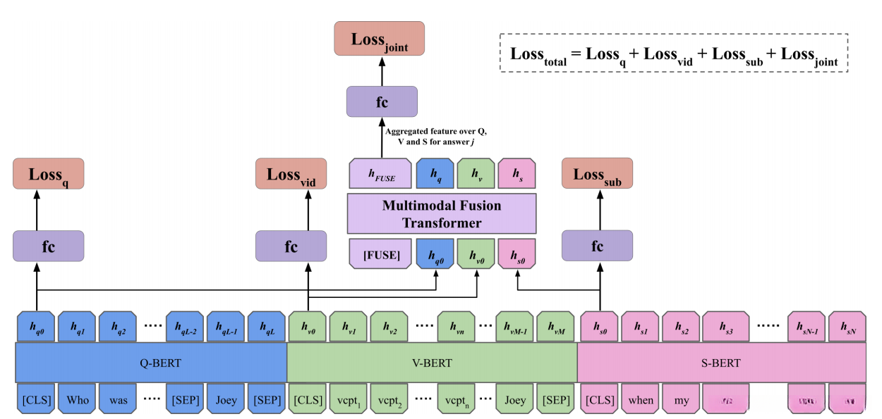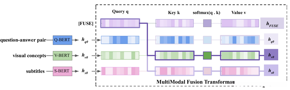 图2,Q-BERT、V-BERT和S-BERT分别表示文本编码器、视觉编码器和字幕编码器。如果hj=Q+Aj是第j个假设,那么Q-BERT取hj,V-BERT取视觉概念V+hj,S-BERT分别取字幕S+hj作为输入。每个BERT的聚合特性与特殊的载体[FUSE]连接,这是一个可训练向量,形成一个序列并输入MMFT模块(详细信息请参见3.2.4节)。每个答案选择的MMFT模块的输出被连接在一起,并被输入到一个线性分类器中以获得答案概率。我们优化单个BERTs,同时优化整个模型。损失表示我们用于训练所提出的架构的目标函数。在推理时,我们只从MMFT模块中获取的特征。
