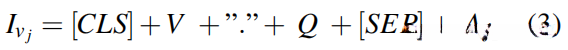我们的文本编码器Q-BERT只接受QA对。问题与每个候选答案Aj配对,其中,j=0、1、2、3、4;|A|=C。BERT使用一个特殊的令牌[CLS]来获得输入序列的聚合特性,并使用[SEP]来处理单独的句子。因此,我们使用[CLS]标记对应的输出作为Q-BERT的聚合特征,使用[SEP]将问题和答案选择视为单独的句子。对文本编码器的输入I被表述为: