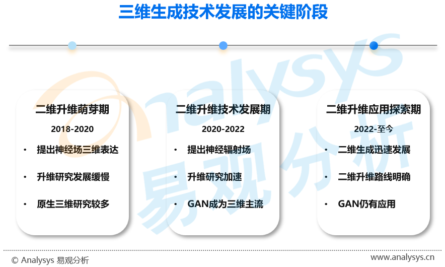 由此可见二维图像生成技术迅速发展并带动了应用领域的飞速发展 由此可知 二维升维型已成为当前人工智能三维生成研究与应用的重要关注点