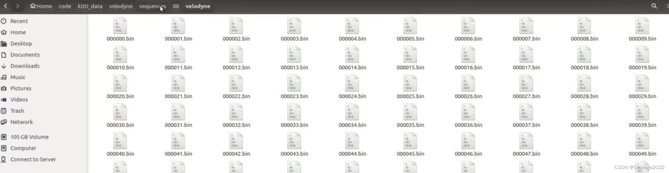 该技术涉及LIDAR数据的获取。位于 velodyne 文件夹下的 sequences 子文件夹内的 00 数据集如图所示: