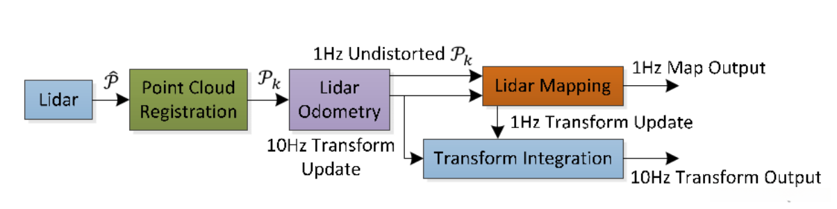 一种极具影响力的激光定位与建图方案,在LOAM算法体系中占据核心地位,在实际应用中通常配备惯性测量单元(IMU),该算法创新性地将Simultaneous Localization and Mapping (SLAM)分解为高频低精度的核心模块与后续处理阶段。