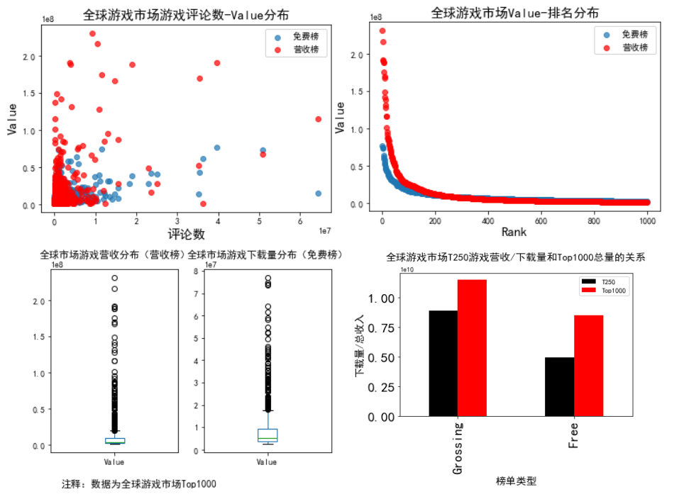 长远来看,评论数量与下载量或营收之间也没有呈现明显的线性相关关系。然而排名与下载量或营收之间则呈现出明显的幂律分布特征,进一步验证了两个榜单的两极分化特征,同时营收榜的赢家通吃的现象表现得更为明显。