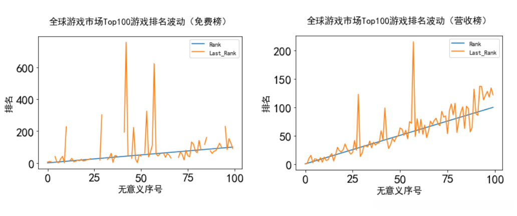 对比两个榜单可以看出,免费榜中有多款 previously不在榜单中的游戏成功占据Top100(数据连接不完整的部分),而营收榜新增的游戏数量相对较少;免费榜的排名波动幅度显著高于营收榜。主要原因是