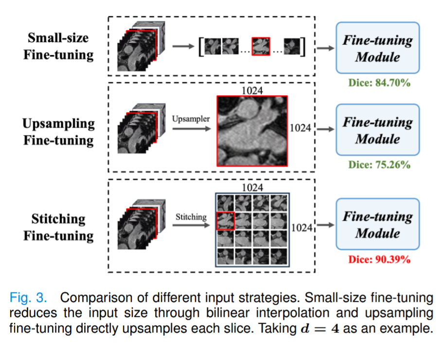 1) 缝合模块 :为了从二维自然图像适应三维医学图像,本文认识到输入分辨率和图像维度是关键因素 。三维体积的切片间空间信息与目标识别息息相关,而在高分辨率图像上训练的大型模型很难推广到低分辨率的医学图像切片上。受此启发,所提的拼接策略(如图 3 所示)将医学图像与自然图像分辨率相匹配,并补充了三维医学图像特有的空间排列。预训练 SAM 模型的输入空间分辨率为 1024 × 1024。拼接策略将三维体积(原始三维图像或三维补丁)逐片排列成 d × d 网格,生成大小为 1024 × 1024 的二维图像。由于不同医疗数据集的切片尺寸各不相同,因此切片分辨率和拼接切片数量之间存在性能权衡。所提方法可以有效管理不同切片数量的图像。对于小比例切片,如 LA 数据集,使用原始三维图像作为输入卷。对于大规模切片,如 BTCV数据集,采用常见的三维处理方式,将体积划分为多个补丁作为输入体积,然后拼接所有切片以实现 1024×1024 的最终尺寸,避免直接缩小大切片。与图 3 中的小尺寸输入微调方法和直接升采样微调方法相比,发现拼接策略有效地解决了图像尺寸和分辨率差异带来的挑战。