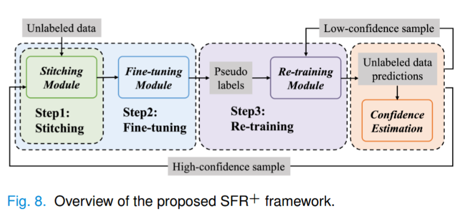 为了进一步增强所提的框架,开发了 SFR 的扩展版本,命名为 SFR+,如图 8 所示。在 SFR 框架中,使用标注样本训练的微调模块向再训练模块单向提供未标注样本的伪标签 。为了更有效地从两个模块中提取和利用未标记数据的信息, SFR+ 引入了置信度估计策略,以区分置信样本和不确定样本 。这种方法可以对微调模块和再训练模块进行选择性优化 。