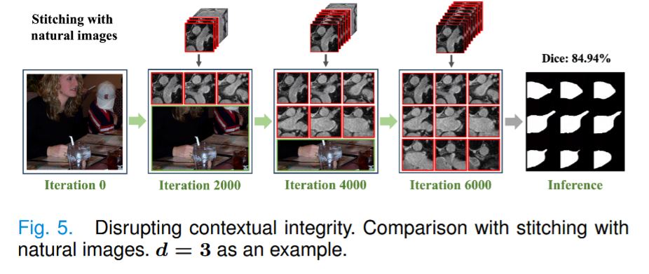 上下文完整性 。拼接模块将一个体素(三维原始图像或三维补丁)重组为 1024 × 1024 图像,从而在单张图像中完整呈现该体素。为了探索上下文完整性对拼接的影响,将医学切片与自然图像进行拼接,同时保持每个切片的分辨率不变。如图 5 所示,通过逐步增加医学切片的数量,从自然图像过渡到医学图像。具体来说,在训练过程的开始阶段,从 PASCAL VOC 2012 数据集中加入自然图像,该数据集共包含 2,913 幅图像。每次迭代,都会从该数据集中随机选择一批自然图像。随着训练的进行,逐步用医学图像切片替换部分自然图像,到最后阶段,只使用医学图像切片。测试时,始终使用完全拼接的医学图像切片。虽然这种方法看似逐渐从自然图像特征调整为医学图像特征,但它实际上破坏了医学图像中解剖结构的完整性,导致性能下降。