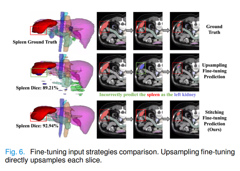 本文注意到,拼接二维切片可能会导致器官出现在周围和相似的区域,因此需要引导 SAM 捕捉这些相似性 。拼接策略保留了切片之间的空间关系,可以有效利用相邻切片中同一目标的信息 。例如,如图 6 所示,同一语义类别(如脾脏)出现在三个相邻切片的相似区域(左上角)。逐片预测的上采样微调方法将整个脾脏(红色)混淆为中间切片中的左肾脏(蓝色)。相反,缝合微调方法可以在所有三张切片中正确识别脾脏。通过结合切片间信息,所提的方法能有效指导 SAM 在不同切片上识别同一器官。相比之下,拼接策略保留了切片之间的空间关系,可以充分利用相邻切片上同一目标的信息。