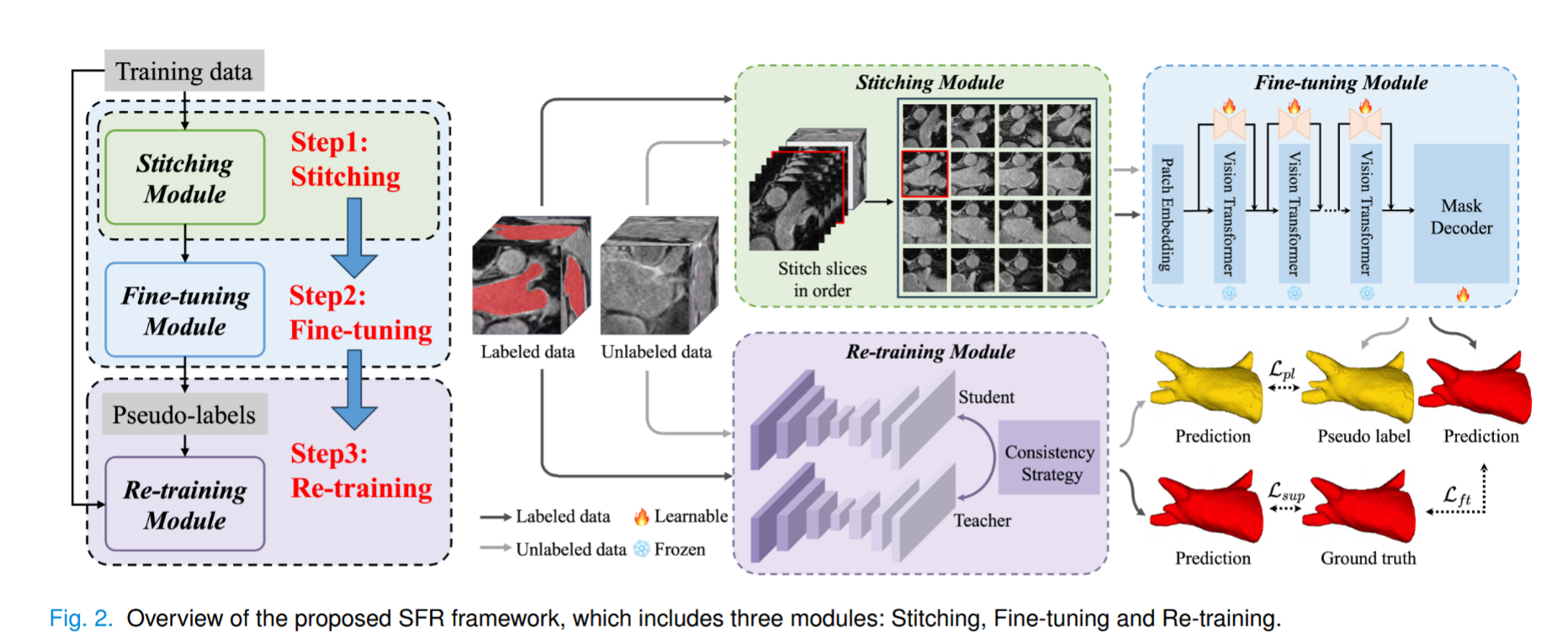 如图 2 所示,构建的 SFR 框架由以下三个模块组成:拼接模块、微调模块和再训练模块。拼接模块可减少自然图像与三维医学图像之间的不匹配 。拼接后的图像被输入到 SAM 中进行微调,并为半监督模块提供初始伪标签。然后,训练三维半监督分割模型。此外,还提出了 SFR+,通过置信度估计有选择地进行微调和再训练,从而增强了所提框架。