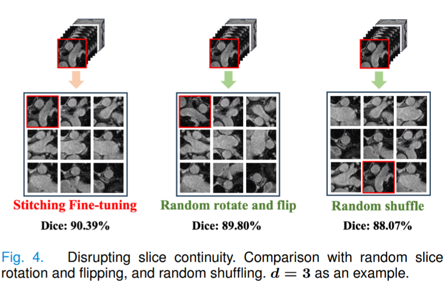这些观察结果表明,拼接策略必须保持切片的连续性和上下文的完整性,从而有效弥合自然图像和医学图像之间在领域和空间维度上的差距。