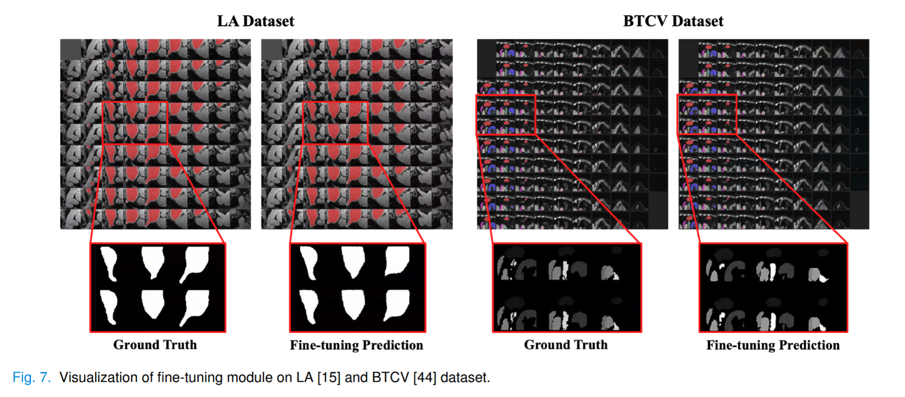 为了验证伪标签在不同数据集上的有效性,以 LA 和 BTCV 数据集为例,在图 7 中展示了微调模块对单个和多个目标数据集的预测。掩码解码器输出一个大尺寸的二维掩码,随后将其还原为三维体积,作为 SSL 模块的伪标签。