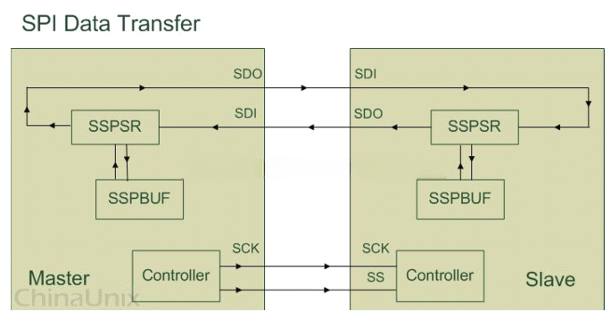 SPI是一个环形总线结构,由SS (CS)、SCK、SDI、SDO构成,时序很简单,在SCK的控制下,两个双向移位寄存器进行数据交换。寄存器中的内容全部移出时,相当于完成了两个寄存器内容的交换。SSPSR控制数据移入移出SSPBUF,controller确定SPI总线的通信模式。