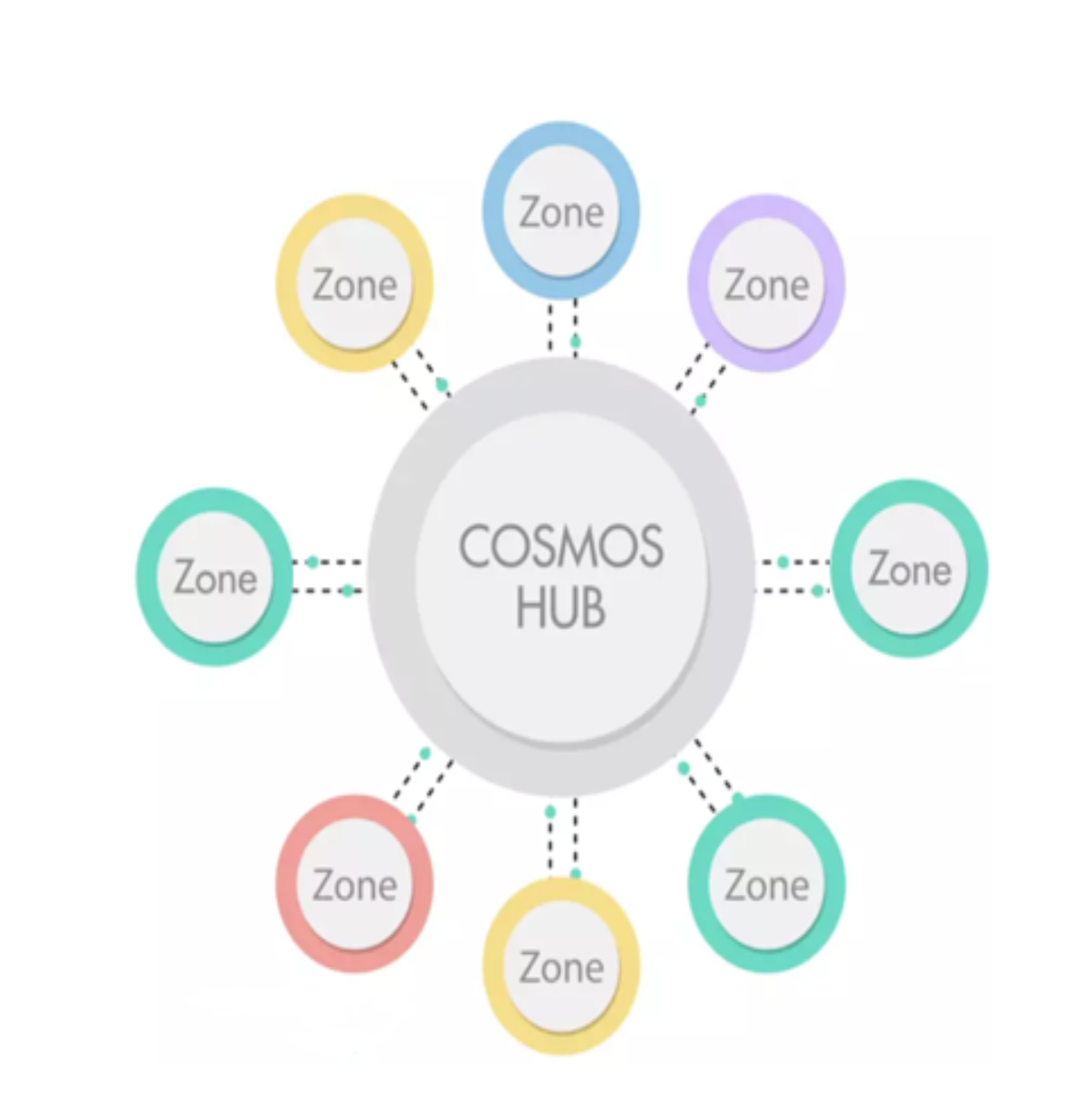 Cosmos 的系统架构如图所示,它中间有一个 Cosmos Hub,周围的叫做 Zone,可以认为中间是一个交换链,周围其他是子链。