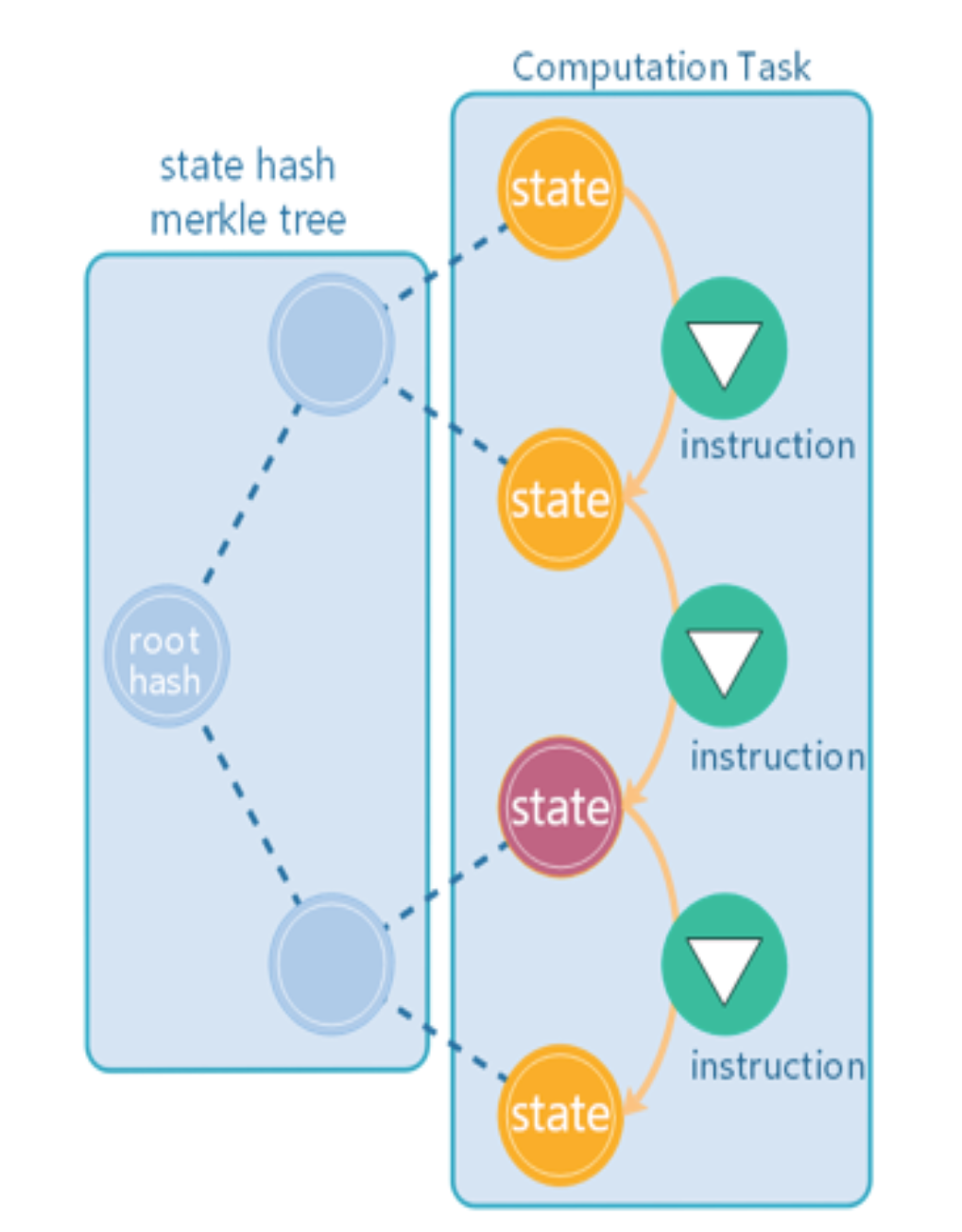 Solver 把每一步的运算状态都算成一个哈希折叠到默克尔树里面,在最后,Solver 把所有运算结果的默克尔树的根哈希,以及运算的最终结果提交到区块链上。