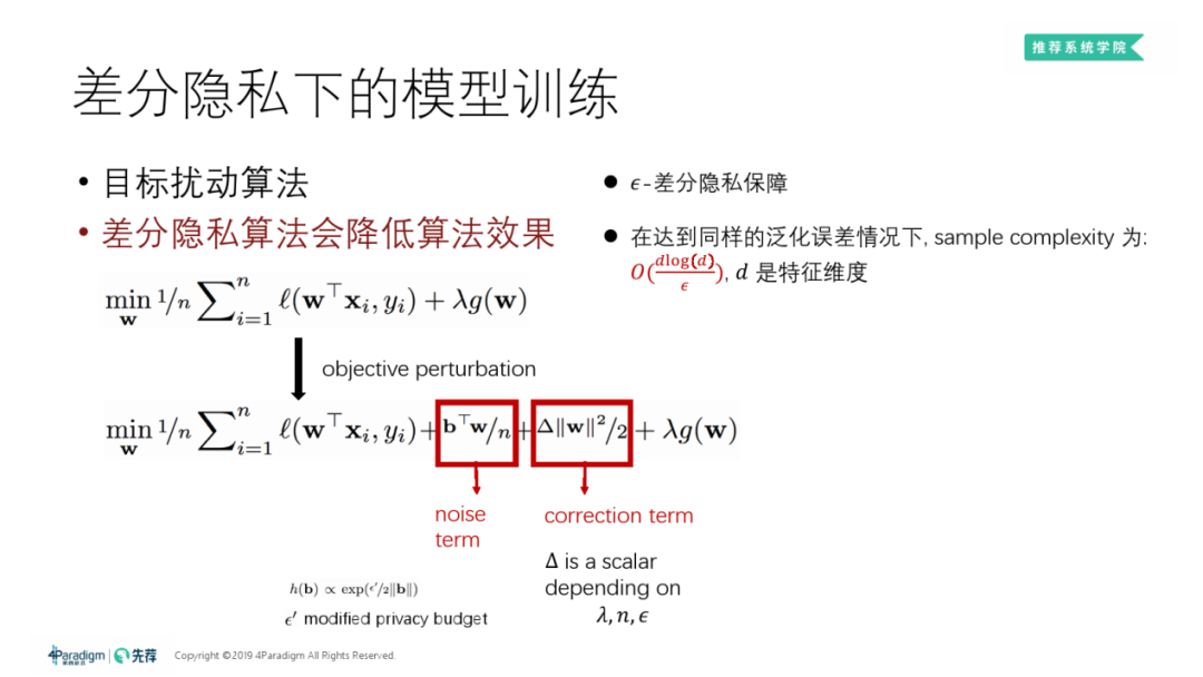 向目标函数中注入一定量的噪声: 训练出的模型会呈现出一定程度上的随机性,并且这种特性表明其能够满足差分隐私的要求。
