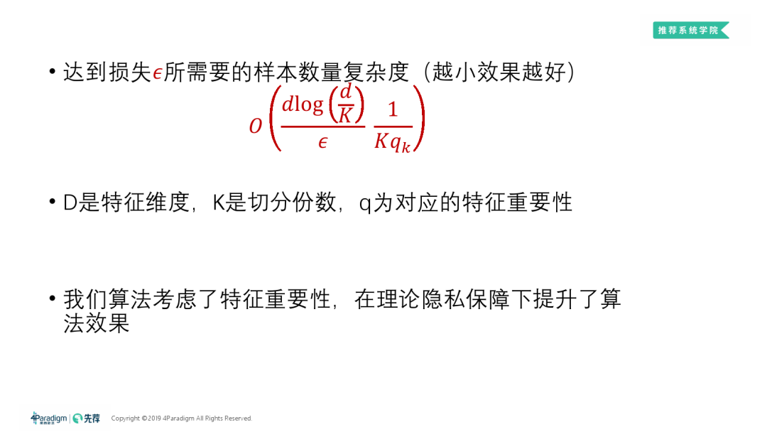 仅仅确保差分隐私是不够的;还需要维持算法性能。从上图所示公式可以看出,在将重要特征分配更高的隐私预算后,在降低训练样本的复杂度的同时(即降低了训练样本的复杂度),生成子模型的效果更加显著。