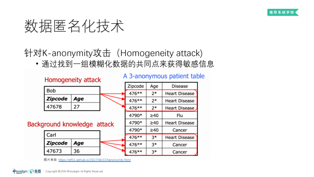 相似性攻击 ( Similarity Attack ):能够针对具备L-Diversity特性的数据实施攻击。 **通过收集多维度的个人信息并结合技术手段将这些信息加以分析处理后从而进一步缩小潜在受害者的范围并精准锁定目标个体。