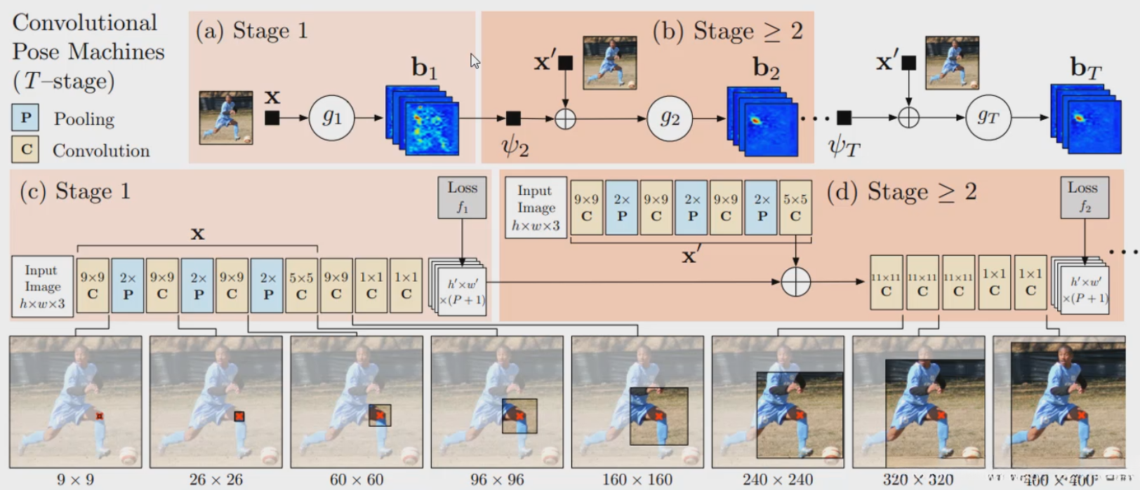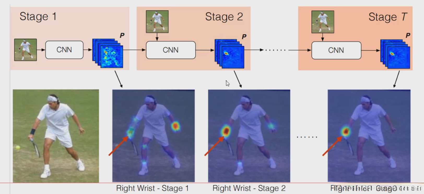 CPM主要是在2016年到2017年间提出的,并为后续的OpenPose研究提供了重要的理论基础。它可作为关键框架,在多个阶段进行关键点定位的逐步精进(stage1预测效果非常差,在后续的阶段中进行纠正和调整)。