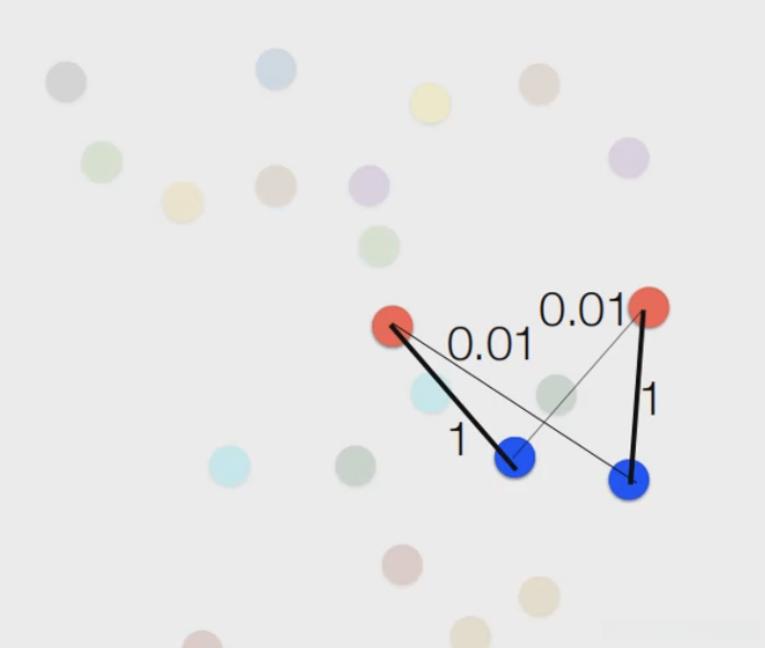 借助一个权重(分数型指标或代价矩阵),这个任务自然就能得以完成。参考下图所示内容:左侧红色节点能够连接到两个蓝色节点;然而左侧较近的那个蓝色节点具有较高的权重(得分为1),而左侧较远的那个蓝色节点则具有较低权重(得分为0.01)。因此,在这种情况下,默认情况下左侧红色节点会优先选择与左侧较近的那个蓝色节点建立联系。