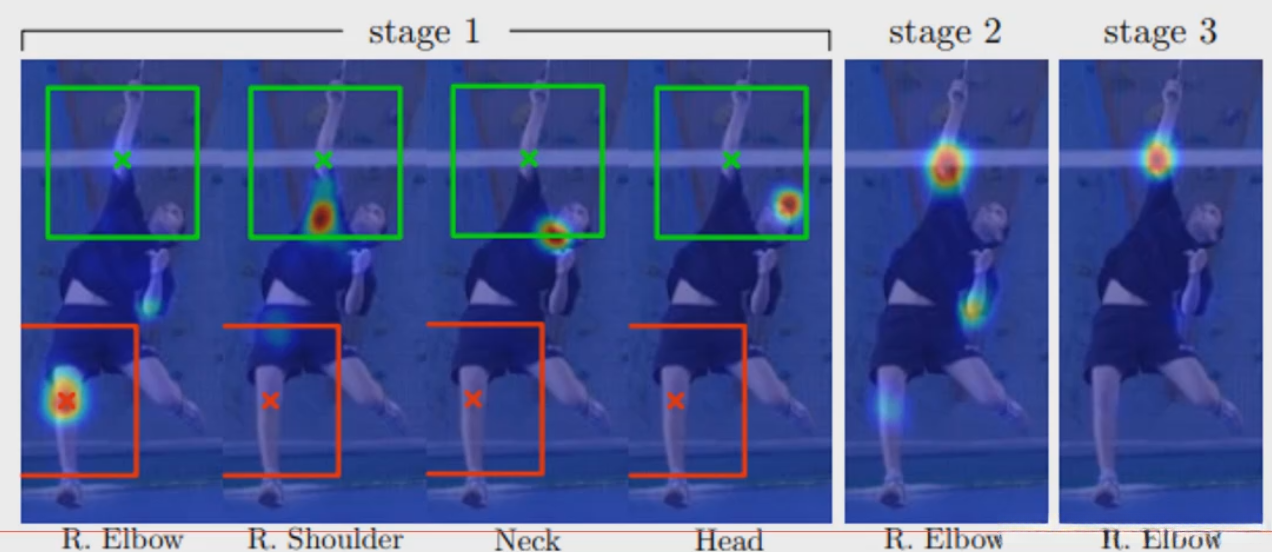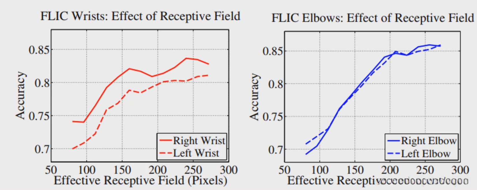 随着阶段数量的增加, 模型的层级深度也随之提升。模型的感受野随之扩大。姿态估计依赖于更为宽广的感受野。