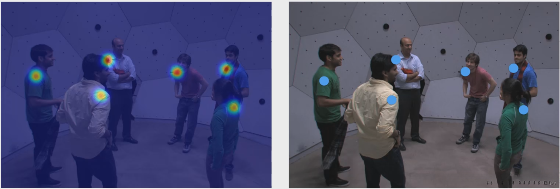 看起来像是一个回归问题,并且在处理数据时需要考虑如何进行标注?我们可以利用热力图来实现对每个关键点的位置进行预测,并且采用高斯分布的方法(即均值周围的区域概率更高)来确定颜色分布。下图展示了肩膀关键点预测的结果: