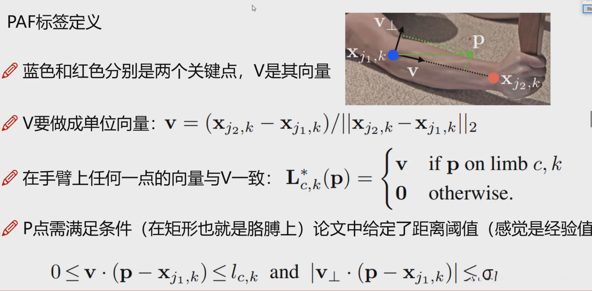 既然我们旨在让模型预测出方向,则应在标签值中体现这种方向性特征。若我们能获取到两个关键点之间的连接关系,则可由此计算出这两个点坐标之间的向量。其结果就是PAF向量。具体原理如下: