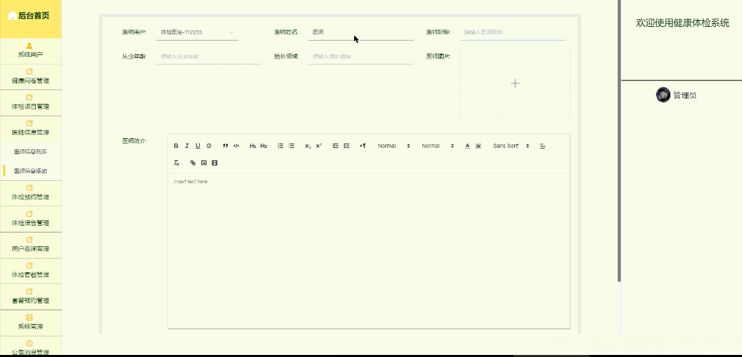 借助健康的体检系统提供给用户,在首页快速访问公告信息及相关的健康资讯内容,并在查看医师信息后完成相应的预约就诊流程;同时浏览体检套餐后完成相应的预约流程。管理人员则拥有丰富的功能权限包括但不限于首页入口使用、用户管理系统操作、健康的档案管理系统运用以及其他的医疗评估管理系统运用等多方面的能力与权限。这些功能设计旨在为用户提供全方位的健康管理服务方案;而管理人员则能够有效地进行数据管理和风险评估工作