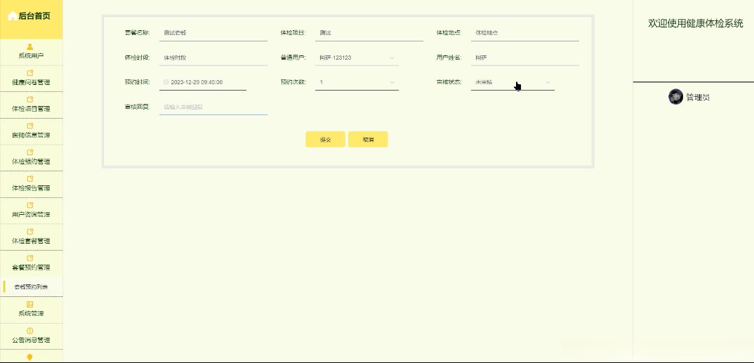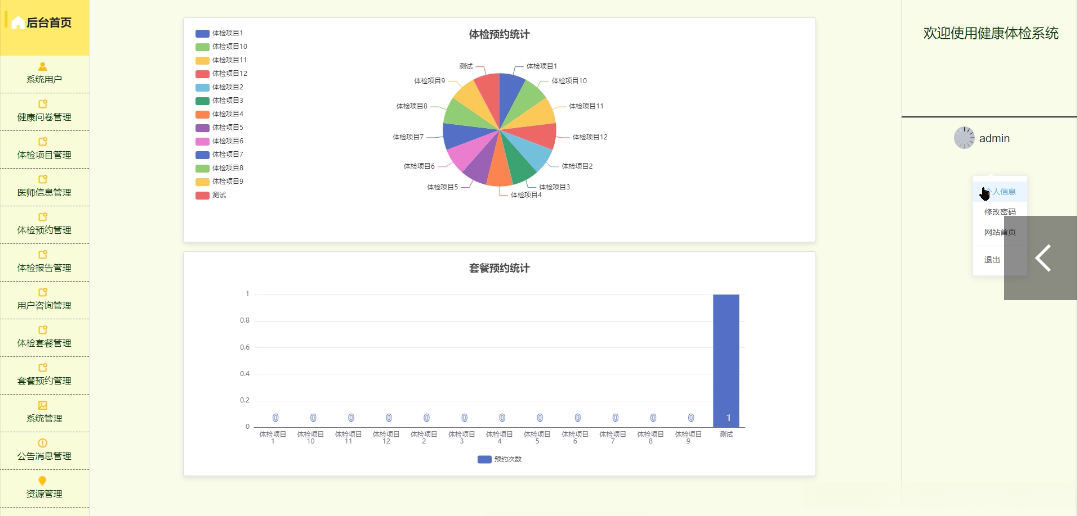The system comprises several core functional modules. Users are able to peruse announcement messages, acquire health information, review physician information, and schedule medical appointments through the homepage. Additionally, users can also explore various medical examination package options and book appointments. Administrators possess enhanced privileges, including user management, healthcare record management, health assessment management, analysis of assessments, health consultations management, risk assessment management, and provision of risk suggestions. Engaging with a health examination system not only promotes technological advancements in healthcare but also fosters the dissemination of health management concepts and enhances the public's overall health standards. Through in-depth exploration and practical application of the system, innovative strategies and methods for effective health management can be further developed and optimized to offer more refined healthcare services and experiences for users.