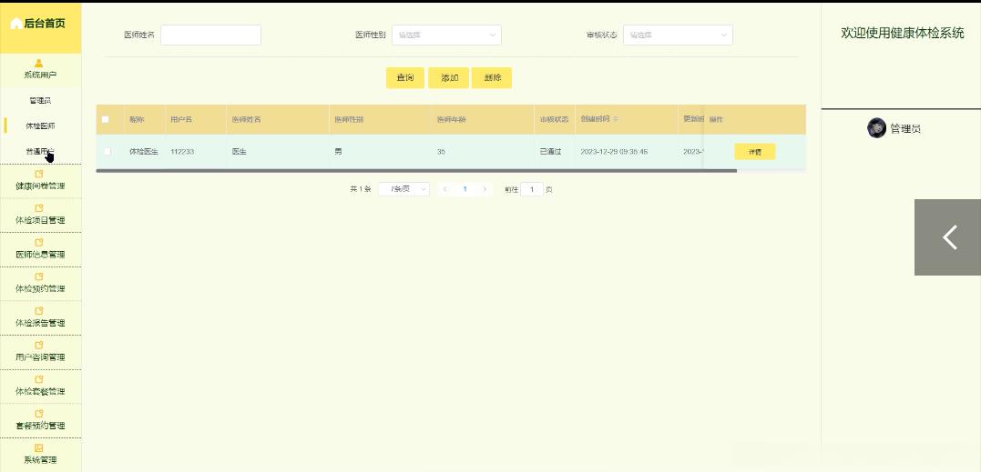 关键词: 健康体检系统;Java语言;Springboot框架;MySQL数据库