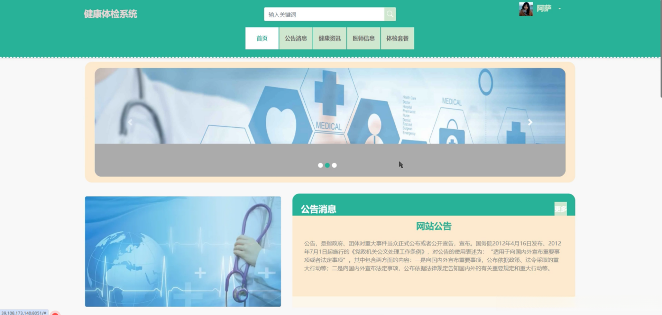 首页是所有用户首次进入系统时的第一站,在此可了解核心服务模块及其操作指引。访问者可在首页浏览公告信息、了解健康资讯,并查阅医生资料及预约诊疗;同时为用户提供体检套餐的选择和服务流程。