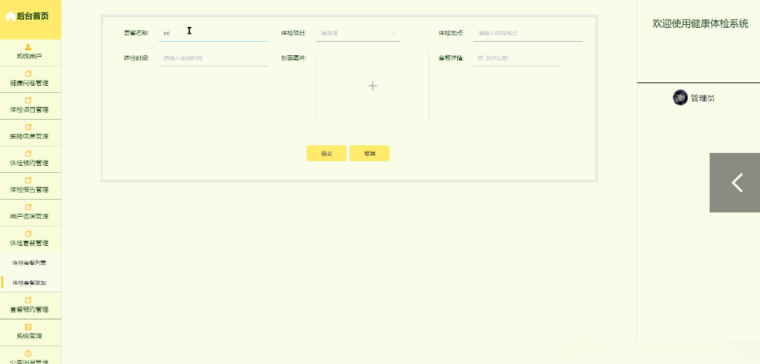 通过体检套餐管理模块,管理员能够对不同类型的体检套餐进行管理和维护。在操作权限方面不仅能够新增并更新现有体检套餐信息还具备删除不需要项目的能力。此外在设置方面管理员可以根据需求指定各体检套餐的价格区间适用人群以及相关的详细说明从而实现个性化的配置功能如图4-10所示