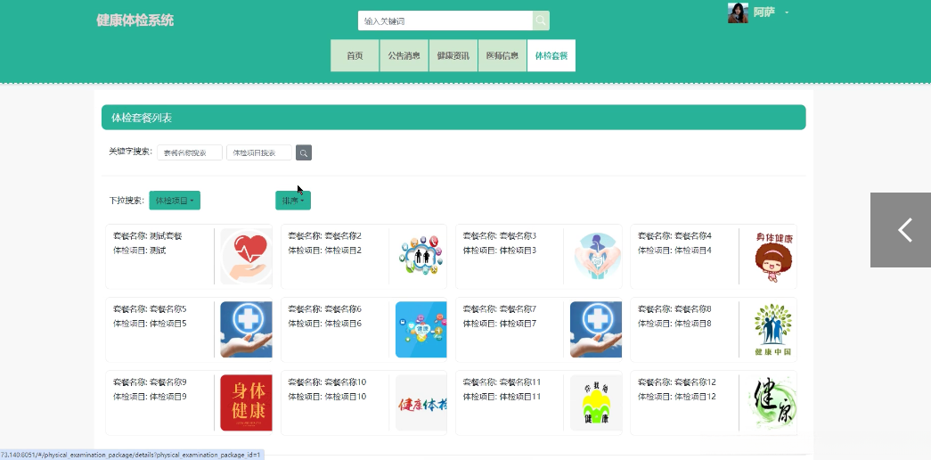 用户可以选择查看不同类型的体检套餐,并登录系统进行预约。根据用户的个人需求与健康状况, 用户可以选择最适合自己的套餐. 系统提供了包括详细内容、价格信息以及适用人群在内的丰富信息. 为了优化用户的健康管理流程, 系统提供了丰富的体检套餐选项与便捷的预约服务. 用户可以通过这一平台更好地了解自身健康的状况,及时发现问题并采取相应的健康管理措施,从而促进整体健康管理效果. 如图4-6所示