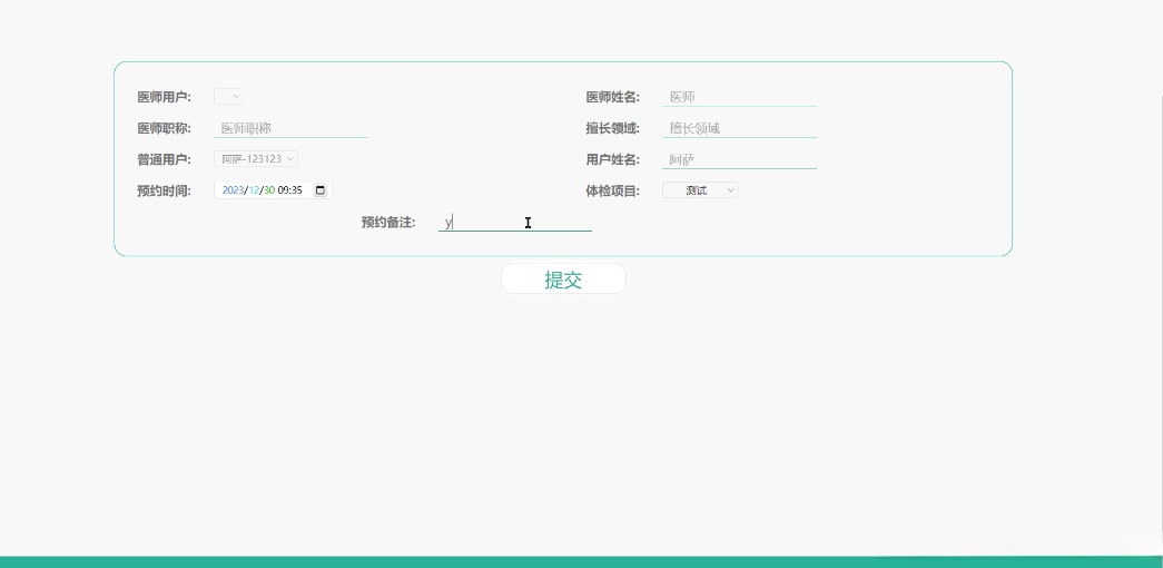 该系统已通过功能验证,在注册、登录、医师资料浏览、预约安排以及体检套餐管理等功能模块均展现出良好性能表现。所有实施的测试案例均已顺利完成并符合预期目标要求。系统能够精确地执行用户的输入指令并相应提供所需服务内容。各项数据统计表明该系统的稳定性与可靠性得到充分验证为用户提供优质的使用体验目前主要关注点集中在后续阶段如何扩展覆盖范围以进一步提升系统的全面性与效能水平