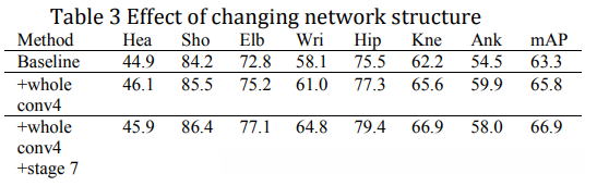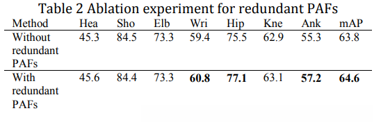 Limited to the time, we conduct the ablation experiment when pre-training on COCO dataset, shown in Table 2. We can observe a significant improvement at wrist, hip and ankle, about 1.5-2%, which proves the effectiveness of redundant PAFs. The ablation experiment uses the same model file, the only difference is using redundant PAFs information or not.
