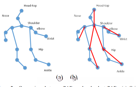 To address this problem, we develop a redundant Part Affinity Fields (PAFs). We increase the connection number between joints, making the connection redundant. Figure 2 shows the comparison between original PAFs and our redundant PAFs. By adding these redundant lines, faulttolerate-rate increases. It is not necessary to detect every connection correctly, since some joint involves multiply connections. The structure between joints is transformed from tree to graph.