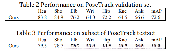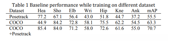 The following paragraphs illustrate the training strategy with baseline method. The baseline model is pre-trained on COCO and then finetuned on PoseTrack dataset. Table 1 shows the performance of every training step on validation dataset.