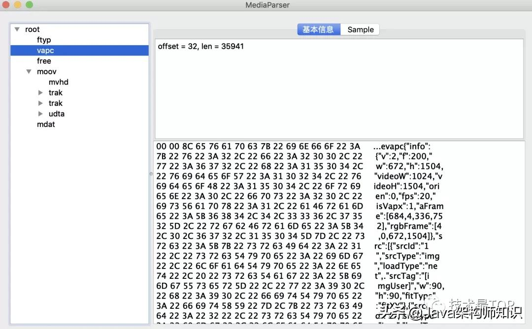 mp4的组织方式与JSON的key-value组织方式很像,被称为一个BOX,我们创建一个新的BOX(vapc VAP Config),JSON内容放到这个BOX里,播放前先读取此BOX然后播放(ps: mp4规范里定义如果无法识别的BOX自动忽略,不影响mp4正常播放流程)。
