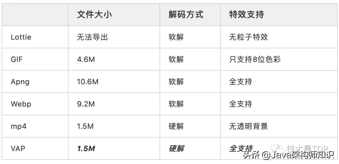 动画越酷炫,对素材大小与解码性能要求越高,调研了很多方案,先给对比表:
